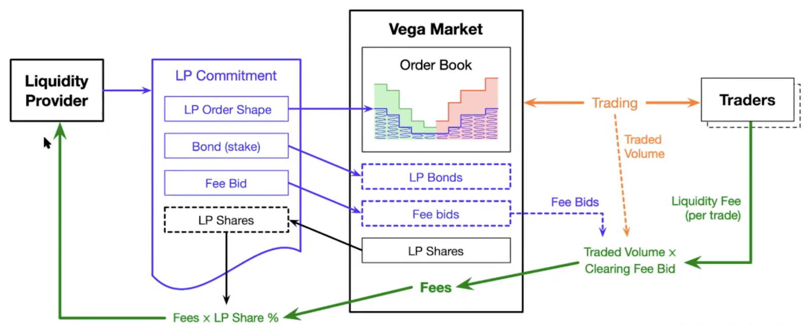 LPs need to make a financial commitment (bond) to provide liquidity at a certain level — the bond determines how much liquidity an LP provides — in order to receive rewards, while being penalized for not upholding the commitment. Vega will automatically size orders, as long as sufficient margin is provided.