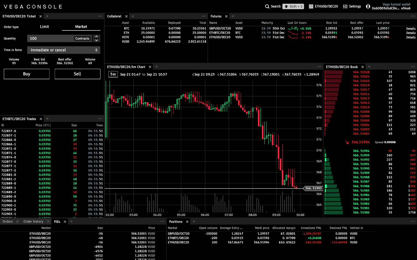 Vega is a decentralized derivatives trading protocol with continuous limit order books or mechanisms such as frequent-batch auctions, constructed as a special purpose layer 1 blockchain, with cross-chain collateral deposits.
