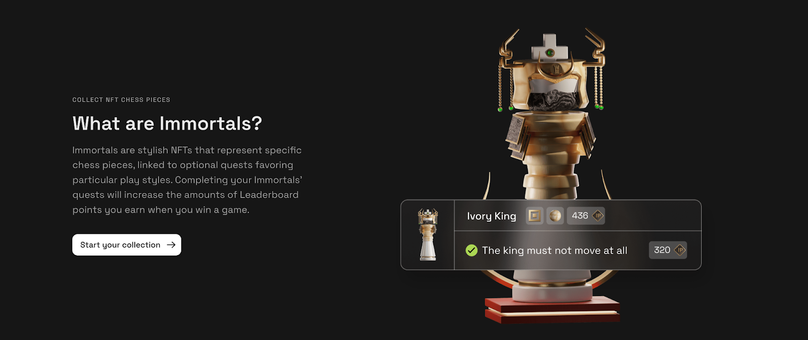 Immortal Game introduced NFTs called “Immortals” which represent chess pieces (pawns, knights, bishops, etc). Players will assemble a team of one to four Immortals and place them on the board. Each of those Immortals will have challenges to complete which will increase winning bonuses (e.g. an offensive Immortal pawn will gain bonuses when it takes other pieces). Immortals can be acquired on Immortal, ImmutableX, and Rarible marketplaces.