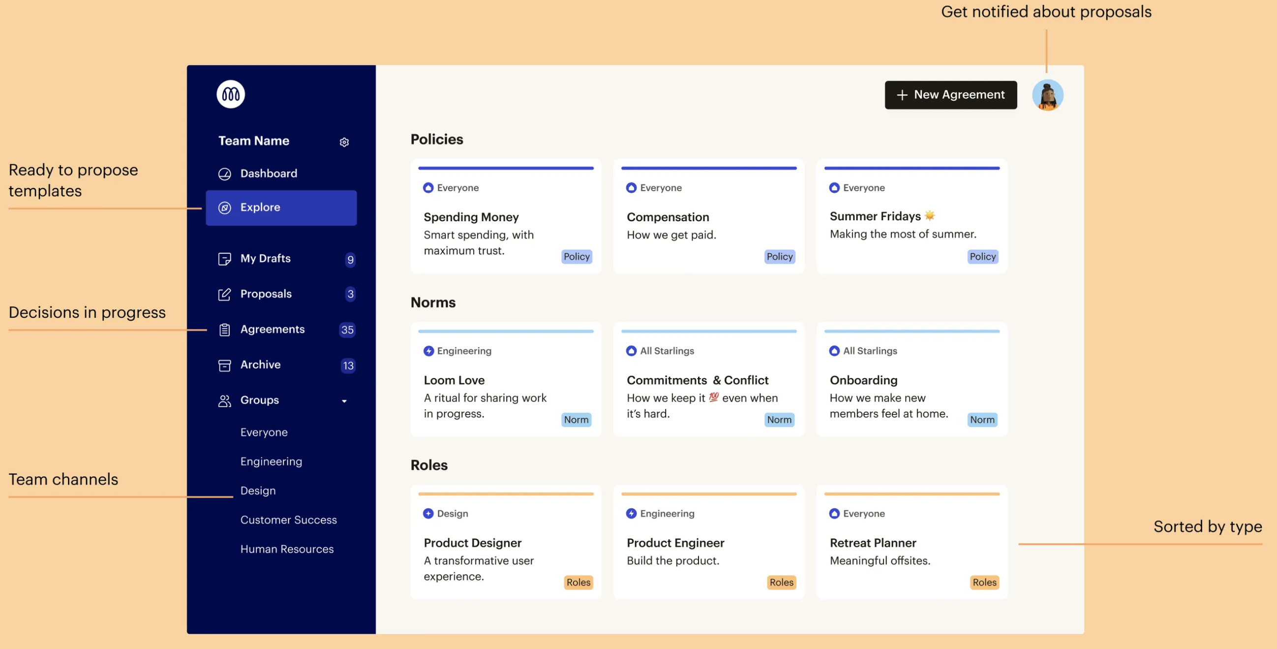 Users are nudged to take note of aspects of their work that are not structured ideally. Anyone can propose changes or a new agreement if they find room for improvement or a shared practice that is already working well, but isn’t written down.
