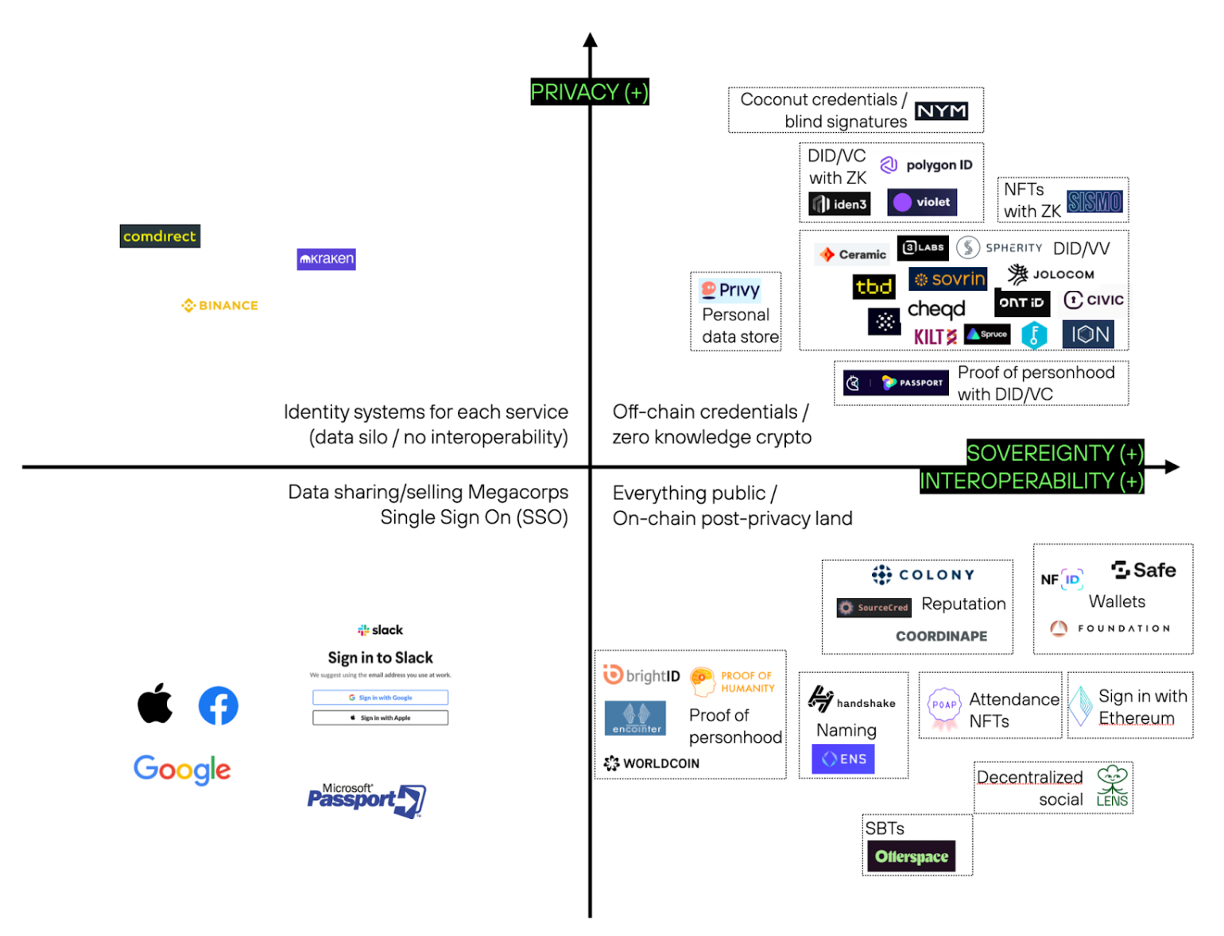 The matrix above shows various projects, grouped according to technologies as well as use-cases to provide examples and highlight the multitude of layers, as well as players in the identity stack. Individual, centralized identity systems provide no interoperability. However, they don’t gather data as widely as data-sharing/selling mega-corporations. Still, such centralized systems have significant risks of data breaches, as seen in the past. Everything on-chain is publicly visible forever, except if there is zero-knowledge cryptography for privacy-preserving proofs in use (which has been making significant progress in recent years but is still in its infancy). DIDs/VCs with data stored off-chain pose a lower attack surface regarding privacy, again while the use of zk-crypto minimizes data disclosure.