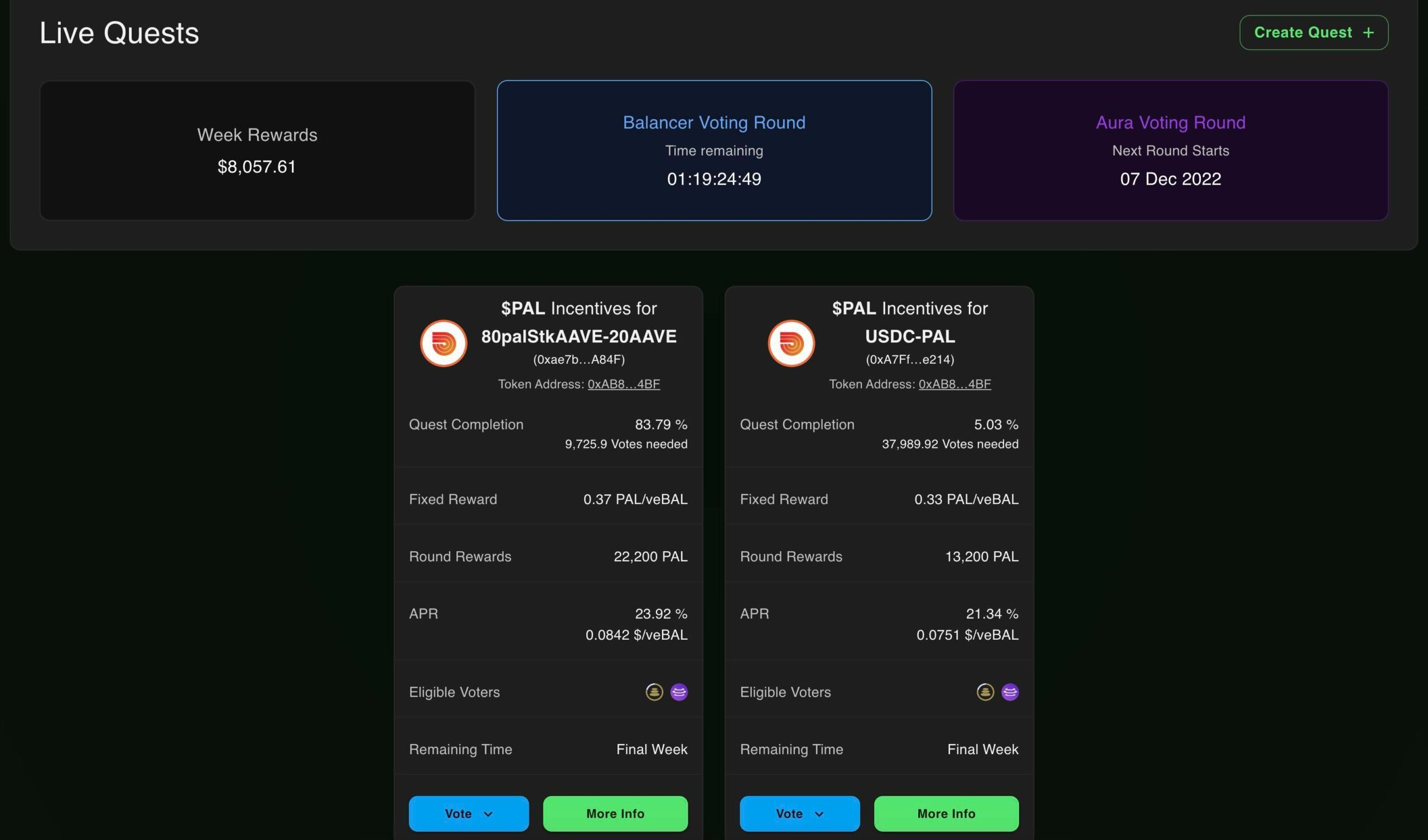 Most recently, Paladin launched their latest product, called “Warden Quest”. The Warden Quest is a meta-governance bounty board where protocols can set up “Quests” for token holders of locked $CRV, $CVX, $BAL and $AURA that come with a monetary incentive. Protocols can specify how much they want to pay per locked token and how many votes in total they want to acquire. Once the required number of votes has been obtained, the quest is closed, thereby protecting early participants from dilution of rewards. The most lucrative quests are usually completed very fast. Currently, most Quests are paying roughly 25% APR for $CRV, $CVX and $BAL votes. Additionally, all of these transactions are being done on-chain and are immutable, meaning both parties can be 100% sure that they receive what they opted in for.