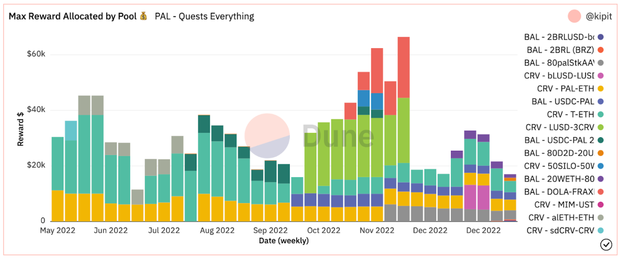 Even during the recent months of market downturn, the Paladin team has managed to onboard a lot of new protocols to deploy new Quests via Warden. The current peak was achieved during November when they had multiple weeks with over $60,000 dollars in Quest rewards distributed through the Quests.