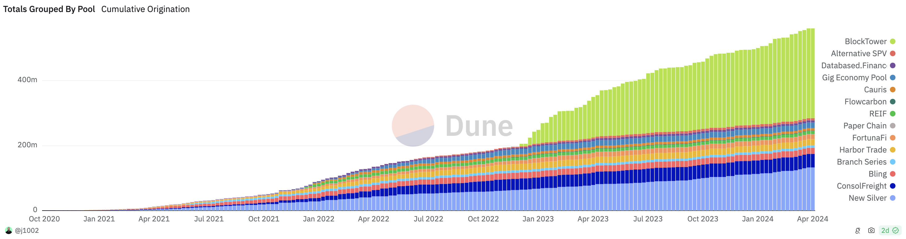 Since 2020, Centrifuge has been developing its Centrifuge Chain, enabling the tokenization of RWAs like invoices, mortgages, consumer loans as well as entire funds. Centrifuge has established itself as a market leader for providing access to high-quality RWAs, such as US Treasuries, for decentralized autonomous organizations (DAOs). Notably, their principal client, MakerDAO, maintains a significant portion of its RWA reserves supporting the stablecoin DAI on Centrifuge’s infrastructure. Presently, Centrifuge is the clear market leader, with a total volume of active loans of approximately $280M and a cumulative origination exceeding $520M.