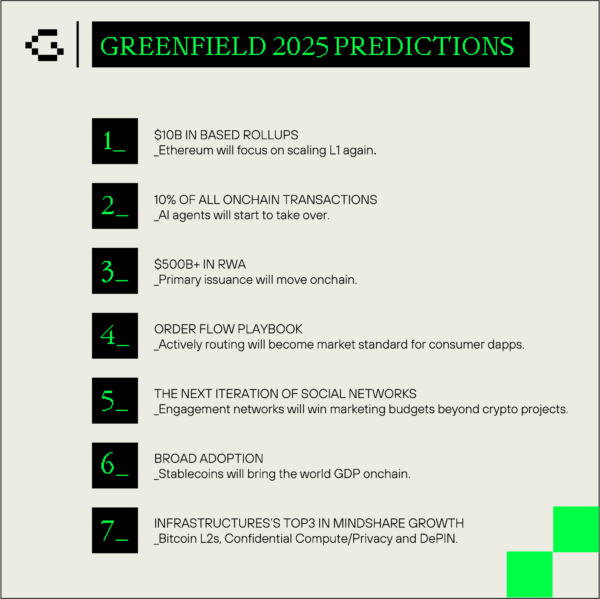 Sometimes strategies turn against you if they are too successful: Ethereum Foundation learned this hard lesson from helping to scale L2s, making slow expensive L1 transactions almost irrelevant for everyday usage. In 2025, Ethereum will take countermeasures and focus on scaling L1 again. We expect a doubled gas limit and shorter blocktimes. The “Ethereum as sequencing layer” narrative will take center stage with $10B TVL in Based rollups/appchains and at least one of the top 5 rollups becoming “Based” by EOY.