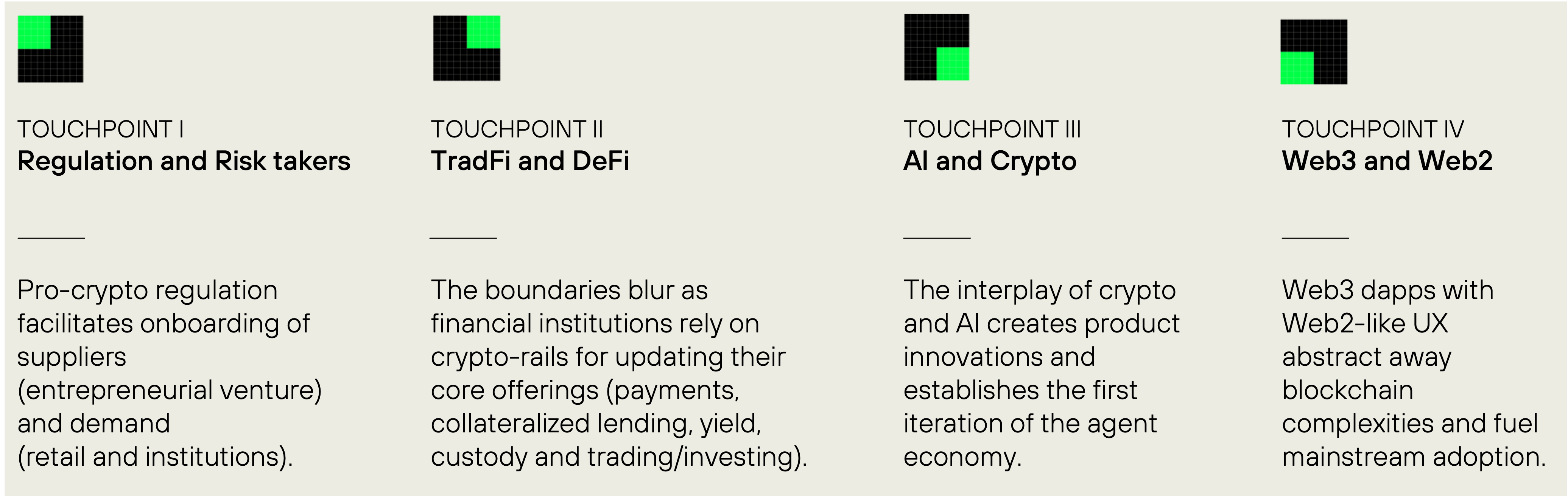 Crypto is still a young breed. It grows new limbs almost every day. Our most critical and demanding job as fund managers is to assess which of these verticals could one day develop into leading narratives and significant market opportunities. No core list should prevent us from keeping our eyes open for new opportunities across the crypto stack. At the same time, it is essential to set a certain focus in the increasingly overwhelming crypto landscape. Our 2025 predictions represent verticals across the Infrastructure, DeFi and Consumer stack to which we generally attribute large and disruptive market potential.