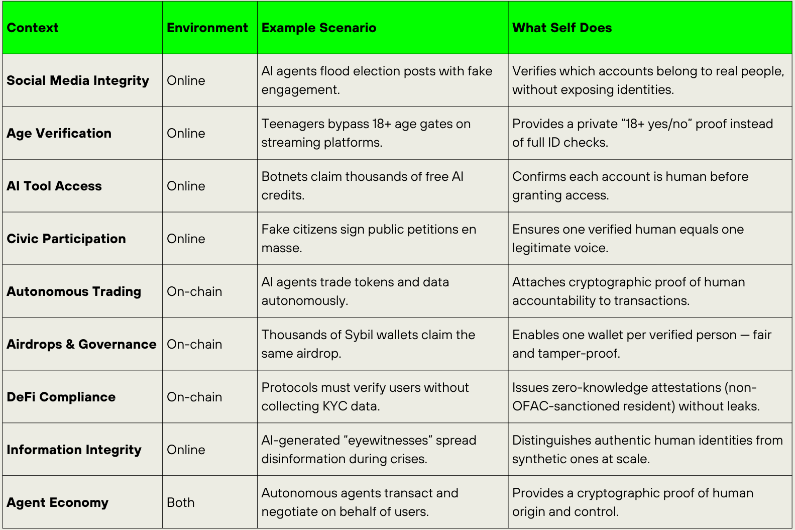 From everyday interactions to global systems, verifying human presence is becoming essential. Whether online or on-chain, Self enables trust in a world where humans and agents act side by side. Some hypothetical (near-future) scenarios to contextualize: