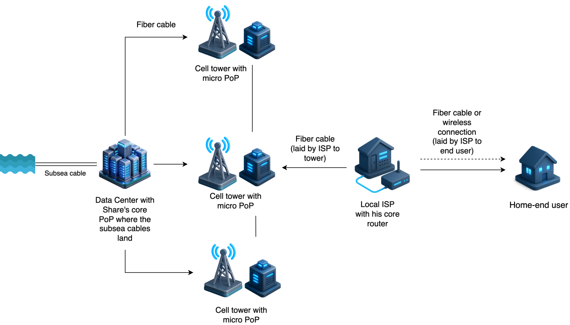 Today, the supply side is ready: subsea capacity is abundant, networking hardware is commoditized, and software-defined infrastructure has matured. At the same time, dense urban areas are already served by thousands of local ISPs, demand exists, but coordination and capital efficiency have lagged.